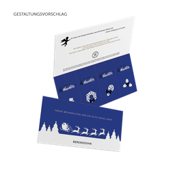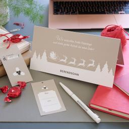 Die Weihnachtszeit ist die Zeit der Besinnung, Freude und Wertschätzung. Mit unseren BERENDSOHN-exklusiven 4YOU (2in1 Grußkarte & Geschenkanhänger) kannst du deine Dankbarkeit jetzt sogar mit Mehrwert verschicken. Die Rückseite der Klappkarte besteht aus 4 vorperforierten Geschenkanhängern. Diese kann der Empfänger deiner Grüße dann leicht heraustrennen, selbst beschriften und mittels Band an seinen Geschenken befestigen. Die Vorderseite der Karte lässt sich ganz individuell und passend für dich gestalten. Die Farbe des Fonds kann angepasst werden und natürlich sind auch die Überschriften, der Grußtext und das einzudruckende Logo frei zu bestimmen. Unser KREATIV SERVICE hilft dir hier völlig kostenfrei bei der Gestaltung und berät dich umfassend.