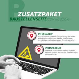 Als Ergänzung zu Ihrer neuen Webseite erhalten Sie eine „Baustellen" bzw. „Coming-soon" Webseite, welche in der Erstellungszeit Ihrer Webseite auf Ihrer Domain angezeigt wird. Dies hat den Vorteil, dass Ihre Kunden bereits Kontaktdaten von Ihnen einsehen können und informiert werden, dass Ihre Webseite gerade in Bearbeitung ist. Diese Baustellen Seite wird 2 Wochen nach Bestelleingang eingerichtet.