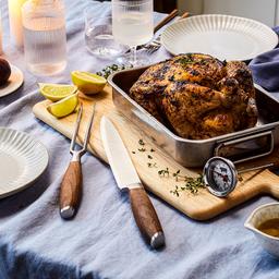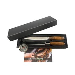 Genussbereiter und Hobbyköche wissen: Schlemmerzeit ist immer. Ob saftiger Rollbraten, zartrosa Gänsekeulen oder saftiger Hirschrücken. Das hochwertig verarbeitete Profi-Tranchier-Besteck mit Teakholzgriffen erweitert die bereits sehr erfolgreiche BERENDSOHN Messerserie als No. 3 zum Set MESSERSCHARF und STEAKMESSER. Es besteht aus einer Tranchiergabel, einem Messer und einem Braten-Thermometer, mit dem der perfekte Garpunkt abgelesen werden kann. Komplettiert wird das Set durch eine Tranchier-Fibel mit wertvollen Tipps und Tricks zum Tranchieren und zur Bratenzubereitung. Als besonderes Highlight bietet die Broschüre auch einen QR-Code, der zu einer Step-by-Step-Anleitung zum Thema tranchieren führt. Der Artikel wird in einem edlen Geschenkkarton mit Schuber verpackt ausgeliefert. Messer: Teakholz, Edelstahl S/S 430, Holzgriff 110 mm, Messerklinge: 200 mm, 148 g Gabel: Teakholz, Edelstahl 420J2, Gabel. 145 mm, Holzgriff 110 mm, 133 g Bratenthermometer: 125 mm, 52 g
