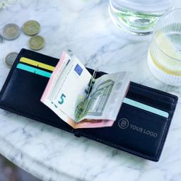 Verschenke die luxuriöse Geldbörse CASH aus vollnarbigem Ziegenleder mit elegantem Nappa-Finish. Die Börse ist mit deinem Logo per CO2-Gravur veredelt und bietet RFID-Schutz, 6 Kreditkartenfächer, ein Scheinfach, zwei Einschubfächer und ein Münzfach. Weiße Steppnähte verleihen dem Design eine elegante Note.