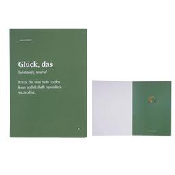 Der Duden ist das Rechtschreibwörterbuch im deutschsprachigen Raum und Wächter der deutschen Sprache. Unsere Grußkarten im Stil des Dudens machen nicht nur Germanisten Freude. Das "Glück" steht im Duden und sollte immer zur Stelle sein. Egal ob zum Geburtstag, Jubiläum, zur Taufe oder Genesung: die originelle Dudenkarte mit Glückscent ist dafür der ideale Werbeträger und erzielt die gewünschte Wirkung beim Empfänger. Bereiten Sie anderen eine kleine Freude und verbreiten Sie Glück mit der sympathischen Glückskarte inkl. Glücksbringer. Ein Umschlag A6 ist beigelegt. FSC-Papier, DIN A6, 14g
