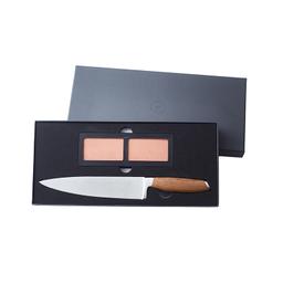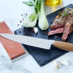 Gemüse & Co. wollen in die richtige Form gebracht werden. Das hochwertige Edelstahl-Univseralmesser mit edlem Teakholzgriff macht es möglich. Es liegt durch seine ergonomische Griffform und sein Gewicht perfekt in der Hand. Eine perfekte Basis um eine Sammlung hochwertiger Messer zu beginnen, die zu einer gut ausgestatteten Küche einfach dazu gehören. Eine dezente Gravur mit Logo und dem chinesischen Schriftzeichen für die Zahl 1 unterstreichen den edlen Charakter des Messers. Der dazugehörige Wasserschleifstein mit der Grobschliff-Fläche (Körnung 3000) schärft stumpfe oder beschädigte Messer mit nur wenigen Zügen; die Feinschliff-Fläche (Körnung 6000) ist ideal für die Ausrüstung und das Polieren der Kanten und perfekt für leichte Ausbesserungen. Damit der Schleifstein fest in der richtigen Position fixiert wird dieser in die rutschfeste Silikonbasis hineingelegt. Im Lieferumfang ist eine ausführliche Schärfanleitung enthalten. Zudem lässt sich auf der BERENDSOHN Website am Produkt auch ein Video dazu ansehen. Der Artikel wird in einem edlen Geschenkkarton verpackt ausgeliefert. Edelstahl, Teakholz, 330 x 50 x 22mm