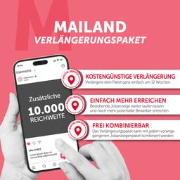 Die Verlängerung bezieht sich auf eine bereits zuvor gebuchte und geschaltete Jobanzeige Mailand, welche grafisch und inhaltlich in unveränderter Form erneut publiziert wird. Ist eine grafisch oder inhaltlich veränderte oder gar neue Anzeige gewünscht, so greift die Option der Verlängerung nicht. Unsere Verlängerung beinhaltet folgende Serviceleistungen für Sie: - Festpreis - Inhalt: 1 Anzeige, geschaltet bei Facebook/Instagram - Schaltung: ca. 8 Wochen - Hohe Lead-Qualität durch einen vorgeschalteten, digitalen Auswahlprozess - Zusendung der eingehenden Leads in Echtzeit - Zugang während der Laufzeit zu unserem Bewerbermanagement-Tool - Auswertungen über die Laufzeit per Link - Finaler Report am Laufzeitende - Kein eigener Account nötig