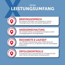 Die Verlängerung bezieht sich auf eine bereits zuvor gebuchte und geschaltete Werbeanzeige Xanten, welche grafisch und inhaltlich in unveränderter Form erneut publiziert wird. Ist eine grafisch oder inhaltlich veränderte oder gar neue Anzeige gewünscht, so greift die Option der Verlängerung nicht. Unser Produkt beinhaltet folgende Serviceleistungen für Sie: - ca. 200.000 Einblendungen oder 2.000 Klicks (Schätzwerte können je nach Zielgruppe abweichen) - Festpreis (Setup und Budget enthalten) ohne Grundgebühr - Inhalt: 1 Anzeige - Schaltung: ca. 12 Wochen oder bis Zielvorgabe erreicht ist - Auswertung nach Klicks und Einblendungen - Schaltung bei Facebook und Instagram - Kein eigener Account notwendig