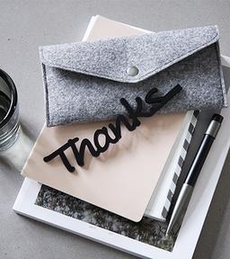 Einfach mal THANKS sagen! Der 3D Schriftzug „Thanks" ist eine charmante Geste, einfach einmal Danke zu sagen. Denn Danke zu sagen ist nicht nur eine Frage des Anstandes. Sich zu bedanken, heißt auch, anzuerkennen und Wert zu schätzen, was ein anderer für uns tut. Es ist nur ein kleines Wort, dennoch es geht immer weniger Menschen über die Lippen. Dabei ist es so immens wichtig – es bereichert das Leben auf einfache, aber wirkungsvolle Art. „Thanks" kann dekorativ hingestellt oder hingelegt werden. Eine passende Grußkarte mit Platz für persönliche Worte ist beigefügt. Der Artikel wird in einem grauen Filz-Etui mit Druckverschluss (180 mm x 75 mm) verpackt ausgeliefert. Aluminiumguss, schwarz matt, 160 x 35 mm, 25 g