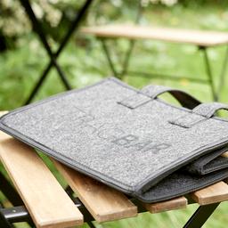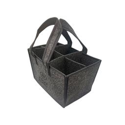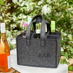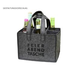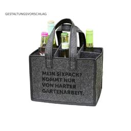 Getränkeversorgung immer im "Griff"! Die 6er Getränketragetasche TRAG-BAR ist nicht nur umweltfreundlich aus recyceltem Filz gefertigt, sondern auch dank ihrer stabilen Konstruktion und dem verstärkten Boden aus Planen-Material besonders robust und langlebig. Der breite Griff mit wertiger Steppung und die herausnehmbaren 6er-Unterteilung sorgen dafür, dass bis zu 6 Flaschen auf einmal sicher und bequem transportiert werden können. Nach der Benutzung lässt sich TRAG-BAR zusammenfalten und platzsparend verstauen. Der Artikel wird in Seidenpapier verpackt ausgeliefert. recyceltes Filz mit Tarpaulin Boden, 200 x 280 x 180 mm, 240 g