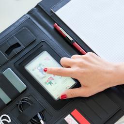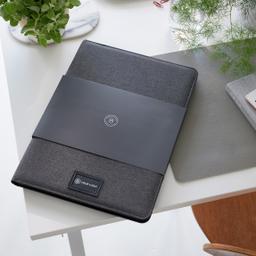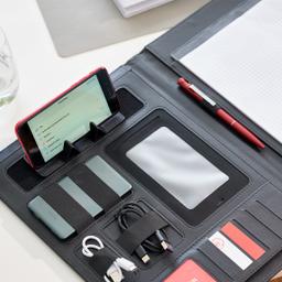 Der exklusive Organizer Büro bietet alles, was man braucht: Schreibblock, diverse Schlaufen und ein Sichtfenster für das Smartphone. Das moderne graue Melange Außenmaterial aus recyceltem PET ist feucht abwischbar. Personalisiere ihn mit einem hochwertigen Doming und mache ihn zum perfekten Werbegeschenk.