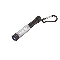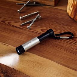 Mini-LED-Taschenlampe als Schlüsselanhänger mit Überraschungseffekt. Eingeschaltet bringt die Taschenlampe mit einer weißen LED (15 Lumen) und einer Leuchtweite von 5m Licht ins Dunkel. 4 Stück LR44 Knopfzellen sind bereits im Lieferumfang enthalten. Dank eines Karabinerhakens lässt sich die Taschenlampe leicht an jedem Schlüssel, Rucksack etc. befestigen und passt dank der kompakten Größe spielend in jede noch so kleine Handtasche. Aber erst durch die Teleskopfunktion des Lampenkorpus wird die Taschenlampe zum wahren Wunderlicht. Denn ausgezogen liegt sie nicht nur besser in der Hand, sondern die eingravierte Werbung wird gleichzeitig hinterleuchtet. Der Artikel wird in Biofolie verpackt ausgeliefert. Aluminium, Kunststoff, 70 x 18 mm, 28 g